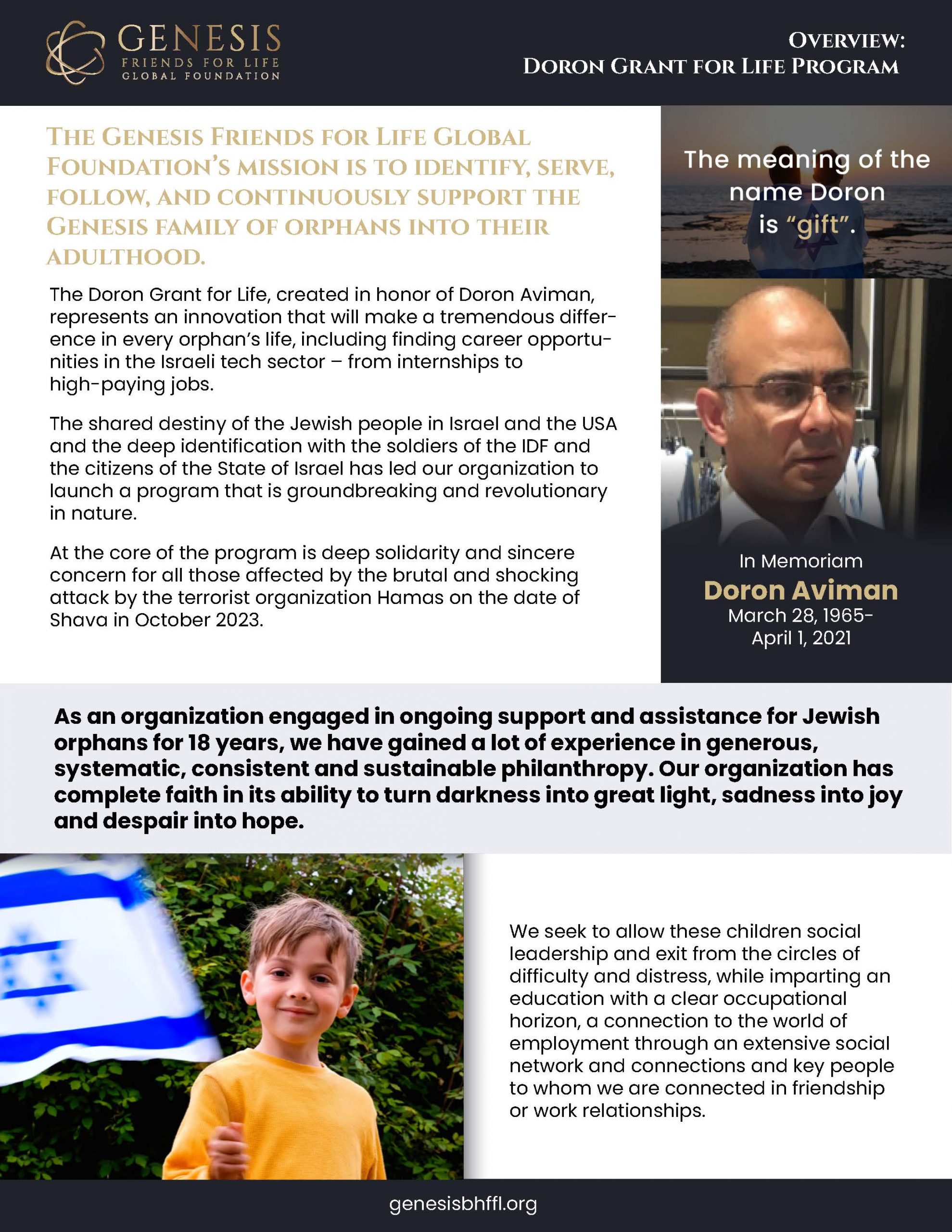 The Genesis Friends for Life Global Foundation is dedicated to supporting orphans and widows impacted by the October 7th attacks. Rooted in a mission of compassion and resilience, FFL provides long-term support to help these children overcome adversity, pursue education, and build meaningful futures. The foundation’s flagship initiative, the Doron Grant for Life, offers career and leadership training, opening doors to opportunities in Israel’s tech sector and beyond. By fostering community and connection, FFL empowers young lives to transform loss into a path toward independence and success.