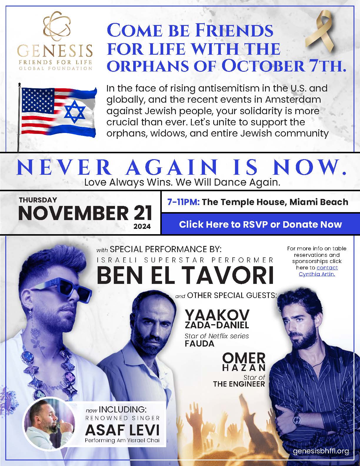 Join Genesis Friends for Life Global Foundation in supporting the orphans and widows affected by the October 7th attacks by becoming a sponsor for the “Never Again is Now” Memorial Gala. Sponsorship levels offer unique benefits, including VIP seating, program recognition, and special introductions during the event.